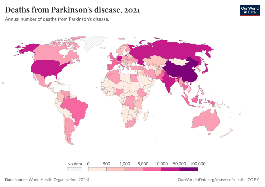 “Data Page: Deaths from Parkinson's disease”, part of the following publication: Esteban Ortiz-Ospina and Max Roser (2016) - “Global Health”. Data adapted from World Health Organization. Retrieved from https://drop-density-mdim.owid.pages.dev:8789/20250909-093708/grapher/deaths-from-parkinsons-disease-ghe.html [online resource] (archived on September 9, 2025).How to cite this data