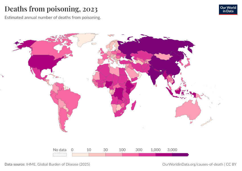 “Data Page: Deaths from poisoning”, part of the following publication: Esteban Ortiz-Ospina and Max Roser (2016) - “Global Health”. Data adapted from IHME, Global Burden of Disease. Retrieved from https://drop-density-mdim.owid.pages.dev:8789/20260211-174736/grapher/deaths-from-poisoning.html [online resource] (archived on February 11, 2026).How to cite this data