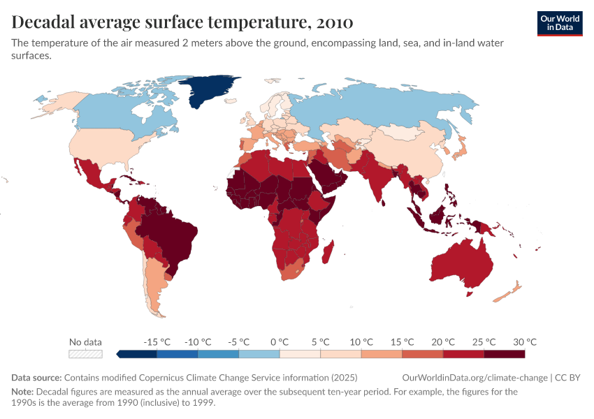 Contains modified Copernicus Climate Change Service information (2025) – with major processing by Our World in Data. “Decadal average surface temperature” [dataset]. Contains modified Copernicus Climate Change Service information, “ERA5 monthly averaged data on single levels from 1940 to present 2” [original data]. Retrieved February 25, 2026 from https://drop-density-mdim.owid.pages.dev:8789/20260210-110915/grapher/decadal-average-surface-temperature.html (archived on February 10, 2026).