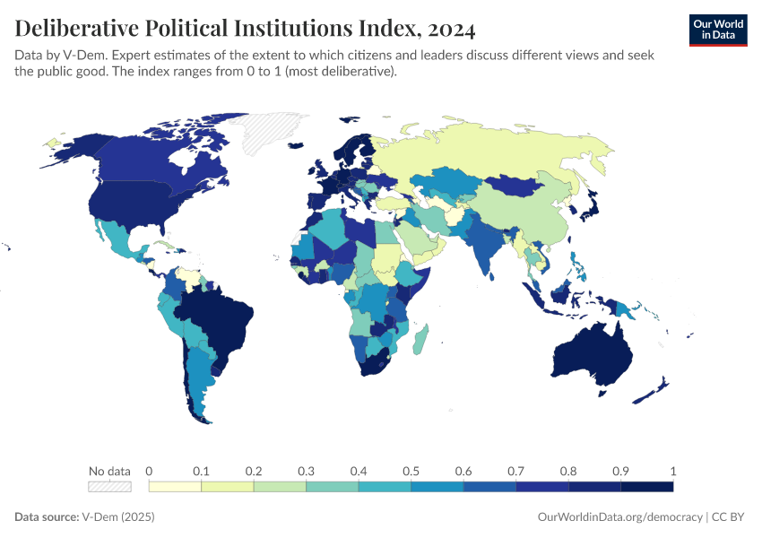 “Data Page: Deliberative political institutions index”, part of the following publication: Bastian Herre, Lucas Rodés-Guirao, and Esteban Ortiz-Ospina (2013) - “Democracy”. Data adapted from V-Dem. Retrieved from https://drop-density-mdim.owid.pages.dev:8789/20260119-070102/grapher/deliberative-political-institutions-index.html [online resource] (archived on January 19, 2026).How to cite this data