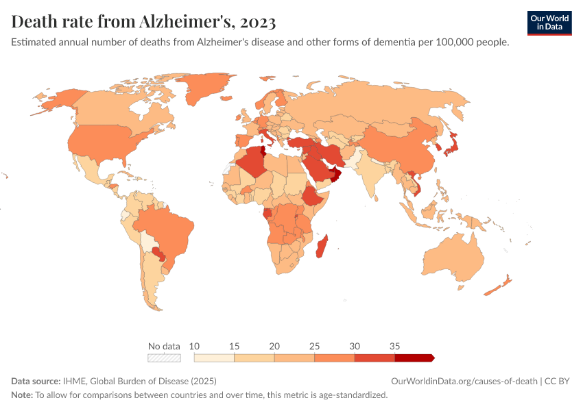 IHME, Global Burden of Disease (2025) – with major processing by Our World in Data. “Death rate from Alzheimer's” [dataset]. IHME, Global Burden of Disease, “Global Burden of Disease - Deaths” [original data]. Retrieved February 25, 2026 from https://drop-density-mdim.owid.pages.dev:8789/20260211-173942/grapher/dementia-death-rates.html (archived on February 11, 2026).