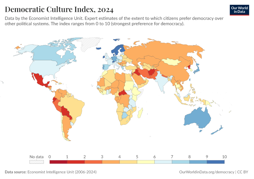Economist Intelligence Unit (2006-2024) – processed by Our World in Data. “Democratic Culture Index” [dataset]. Economist Intelligence Unit, “Democracy Index 2021: The China challenge”; Economist Intelligence Unit, “Democracy Index 2022: Frontline democracy and the battle for Ukraine”; Economist Intelligence Unit, “Democracy Index 2023: Age of Conflict”; Economist Intelligence Unit, “Democracy Index 2024: What's wrong with representative democracy?”; Gapminder, “Democracy Index v4”; Various sources, “Population” [original data]. Retrieved February 25, 2026 from https://drop-density-mdim.owid.pages.dev:8789/20260119-070102/grapher/democratic-culture-index-eiu.html (archived on January 19, 2026).