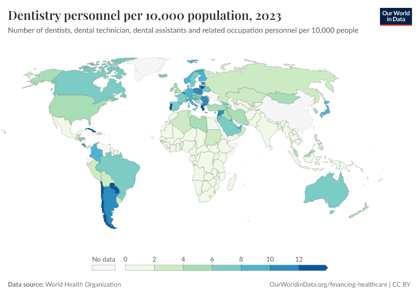 “Data Page: Dentistry personnel per 10,000 population”. Our World in Data (2026). Data adapted from World Health Organization. Retrieved from https://drop-density-mdim.owid.pages.dev:8789/20260130-180113/grapher/dentistry-personnel-per-1000.html [online resource] (archived on January 30, 2026).How to cite this data
