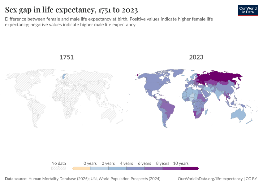 “Data Page: Life expectancy at birth”, part of the following publication: Saloni Dattani, Lucas Rodés-Guirao, Hannah Ritchie, Esteban Ortiz-Ospina, and Max Roser (2023) - “Life Expectancy”. Data adapted from Human Mortality Database, United Nations. Retrieved from https://drop-density-mdim.owid.pages.dev:8789/20251022-222946/grapher/difference-in-female-and-male-life-expectancy-at-birth.html [online resource] (archived on October 22, 2025).How to cite this data
