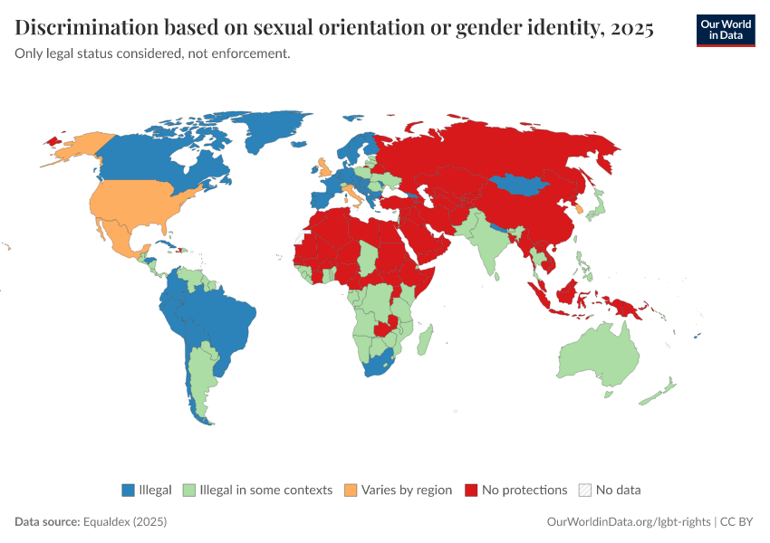 Equaldex (2025) – with major processing by Our World in Data. “Discrimination based on sexual orientation or gender identity” [dataset]. Equaldex, “Equaldex” [original data]. Retrieved February 25, 2026 from https://drop-density-mdim.owid.pages.dev:8789/20250909-093708/grapher/discrimination-lgbt-equaldex.html (archived on September 9, 2025).