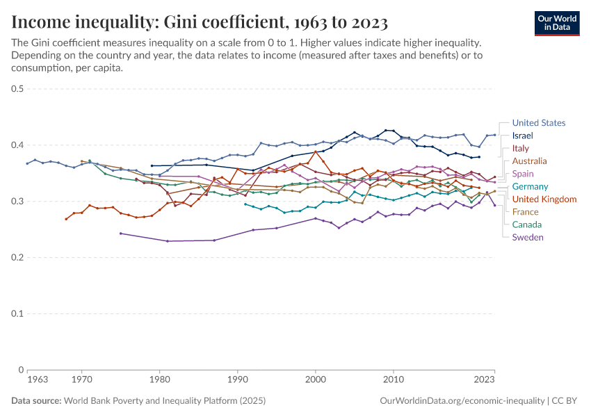“Data Page: Income inequality: Gini coefficient”, part of the following publication: Joe Hasell, Bertha Rohenkohl, Pablo Arriagada, Esteban Ortiz-Ospina, and Max Roser (2023) - “Economic Inequality”. Data adapted from World Bank Poverty and Inequality Platform. Retrieved from https://drop-density-mdim.owid.pages.dev:8789/20260127-114142/grapher/economic-inequality-gini-index.html [online resource] (archived on January 27, 2026).