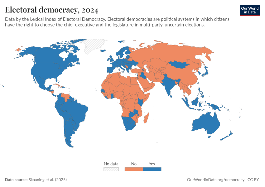 Skaaning et al. (2025) – processed by Our World in Data. “Electoral democracy” [dataset]. Skaaning et al., “Lexical Index of Electoral Democracy (LIED) v6.8” [original data]. Retrieved February 25, 2026 from https://drop-density-mdim.owid.pages.dev:8789/20260119-065148/grapher/electoral-democracy-lexical.html (archived on January 19, 2026).