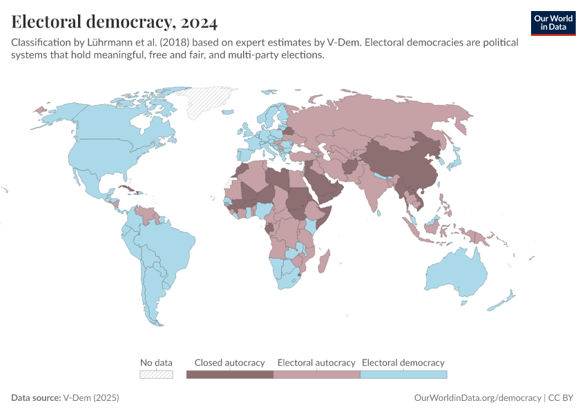 V-Dem (2025) – processed by Our World in Data. “Political regime – reduced” [dataset]. V-Dem, “Democracy report v15” [original data]. Retrieved February 25, 2026 from https://drop-density-mdim.owid.pages.dev:8789/20260119-070102/grapher/electoral-democracy-row.html (archived on January 19, 2026).