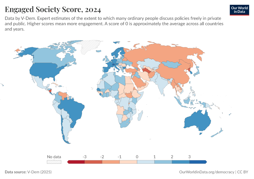 “Data Page: Engaged society”, part of the following publication: Bastian Herre, Lucas Rodés-Guirao, and Esteban Ortiz-Ospina (2013) - “Democracy”. Data adapted from V-Dem. Retrieved from https://drop-density-mdim.owid.pages.dev:8789/20260204-170225/grapher/engaged-society-score.html [online resource] (archived on February 4, 2026).How to cite this data