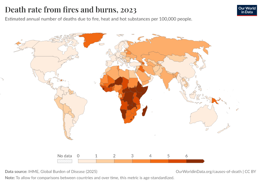 IHME, Global Burden of Disease (2025) – with major processing by Our World in Data. “Death rate from fires and burns” [dataset]. IHME, Global Burden of Disease, “Global Burden of Disease - Deaths” [original data]. Retrieved February 25, 2026 from https://drop-density-mdim.owid.pages.dev:8789/20260211-173942/grapher/fire-death-rates.html (archived on February 11, 2026).