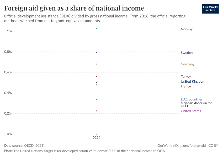 “Data Page: Foreign aid given as a share of national income”, part of the following publication: Bastian Herre, Pablo Arriagada, Simon van Teutem, and Hannah Ritchie (2024) - “Foreign Aid”. Data adapted from OECD. Retrieved from https://drop-density-mdim.owid.pages.dev:8789/20251230-141326/grapher/foreign-aid-given-as-a-share-of-national-income.html [online resource] (archived on December 30, 2025).How to cite this data