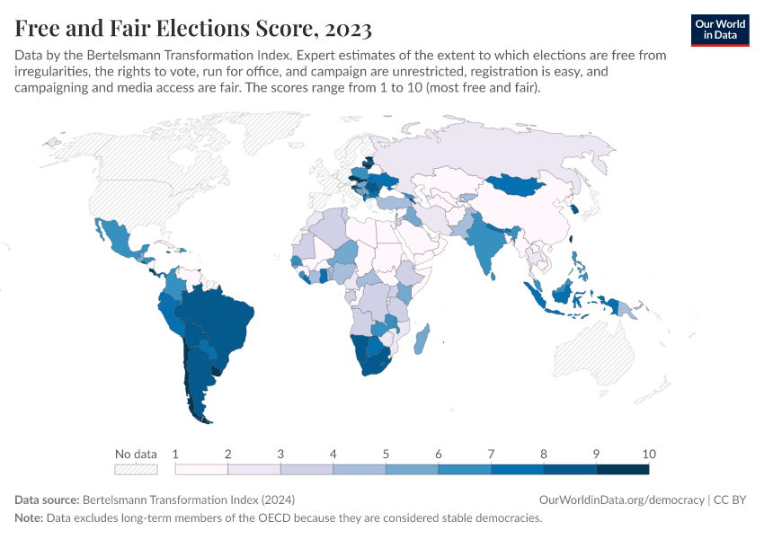 “Data Page: Free and Fair Elections Score”, part of the following publication: Bastian Herre, Lucas Rodés-Guirao, and Esteban Ortiz-Ospina (2013) - “Democracy”. Data adapted from Bertelsmann Transformation Index. Retrieved from https://drop-density-mdim.owid.pages.dev:8789/20260204-170225/grapher/free-fair-elections-bti.html [online resource] (archived on February 4, 2026).How to cite this data