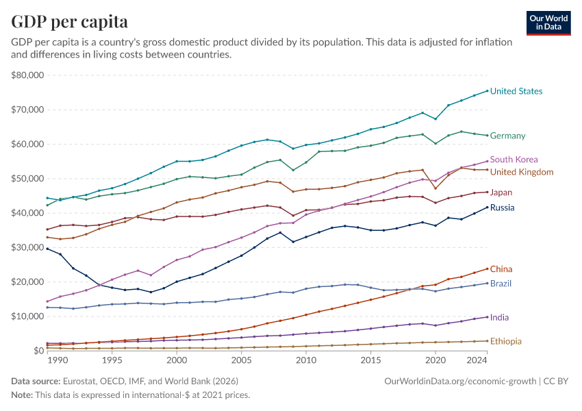 “Data Page: GDP per capita”, part of the following publication: Max Roser, Bertha Rohenkohl, Pablo Arriagada, Joe Hasell, Hannah Ritchie, and Esteban Ortiz-Ospina (2023) - “Economic Growth”. Data adapted from Eurostat, OECD, IMF, and World Bank. Retrieved from https://drop-density-mdim.owid.pages.dev:8789/20260202-180243/grapher/gdp-per-capita-worldbank.html [online resource] (archived on February 2, 2026).