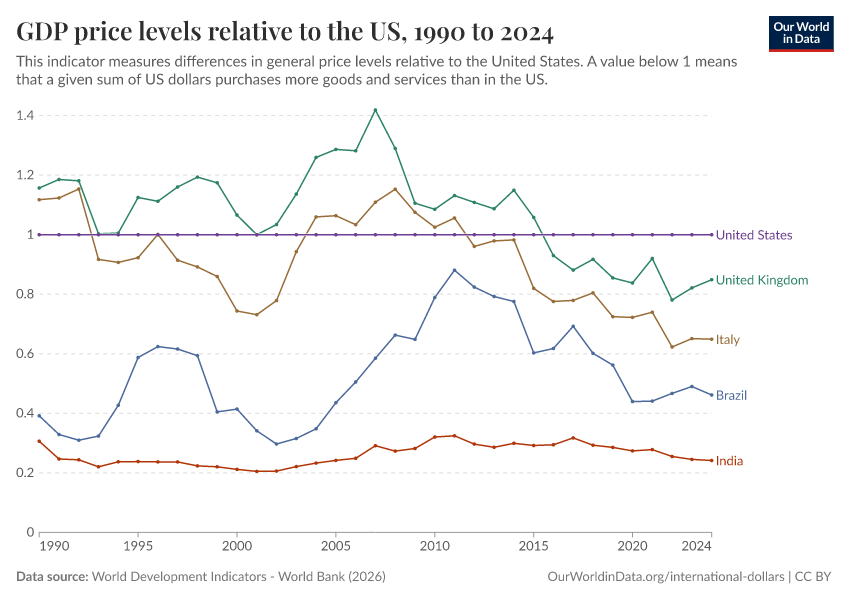 “Data Page: GDP price levels relative to the US”, part of the following publication: Max Roser, Bertha Rohenkohl, Pablo Arriagada, Joe Hasell, Hannah Ritchie, and Esteban Ortiz-Ospina (2023) - “Economic Growth”. Data adapted from World Development Indicators - World Bank. Retrieved from https://drop-density-mdim.owid.pages.dev:8789/20260202-180243/grapher/gdp-price-levels-relative-to-the-us.html [online resource] (archived on February 2, 2026).