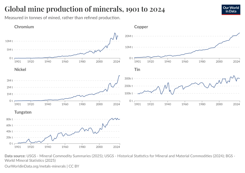 USGS - Mineral Commodity Summaries (2025); USGS - Historical Statistics for Mineral and Material Commodities (2024); BGS - World Mineral Statistics (2025) – with major processing by Our World in Data. “Global mine production of minerals” [dataset]. United States Geological Survey, “Mineral Commodity Summaries”; United States Geological Survey, “Historical Statistics for Mineral and Material Commodities”; British Geological Survey, “World Mineral Statistics” [original data]. Retrieved February 25, 2026 from https://drop-density-mdim.owid.pages.dev:8789/20260116-170644/grapher/global-mine-production-minerals.html (archived on January 16, 2026).