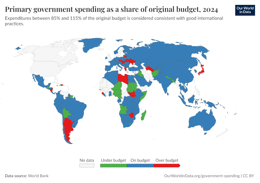 “Data Page: Primary government spending as a share of original budget”. Our World in Data (2026). Data adapted from World Bank. Retrieved from https://drop-density-mdim.owid.pages.dev:8789/20251120-211749/grapher/govt-expenditure-share-budget.html [online resource] (archived on November 20, 2025).How to cite this data