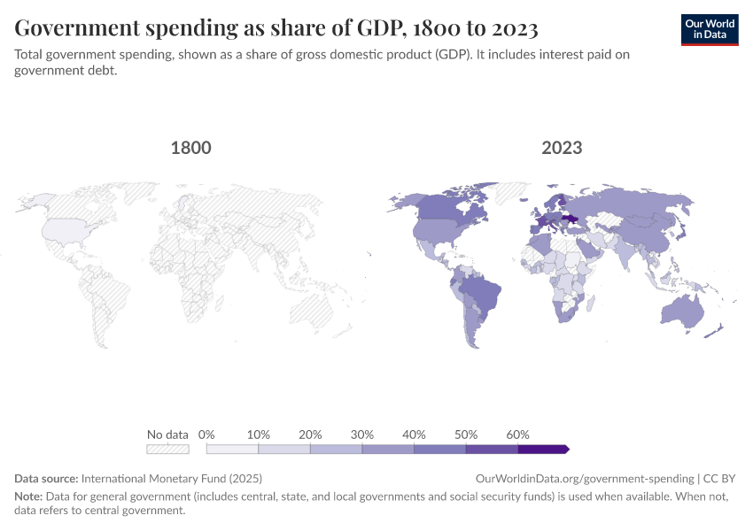 International Monetary Fund (2025) – with minor processing by Our World in Data. “Government spending as share of GDP” [dataset]. International Monetary Fund, “Public Finances in Modern History” [original data]. Retrieved February 25, 2026 from https://drop-density-mdim.owid.pages.dev:8789/20250909-093708/grapher/historical-gov-spending-gdp.html (archived on September 9, 2025).