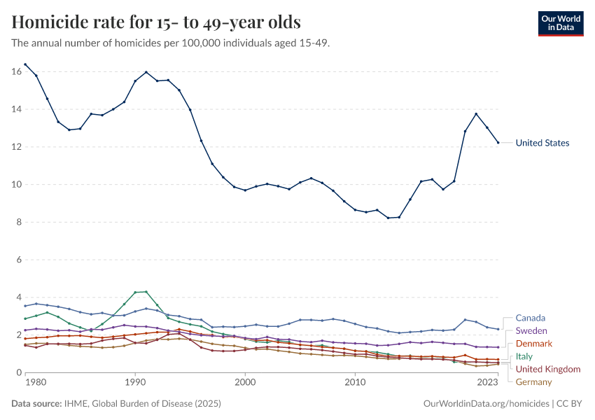 IHME, Global Burden of Disease (2025) – with major processing by Our World in Data. “Homicide rate for 15- to 49-year olds” [dataset]. IHME, Global Burden of Disease, “Global Burden of Disease - Deaths” [original data]. Retrieved February 25, 2026 from https://drop-density-mdim.owid.pages.dev:8789/20260211-174736/grapher/homicide-rate-in-15--to-49-year-olds.html (archived on February 11, 2026).