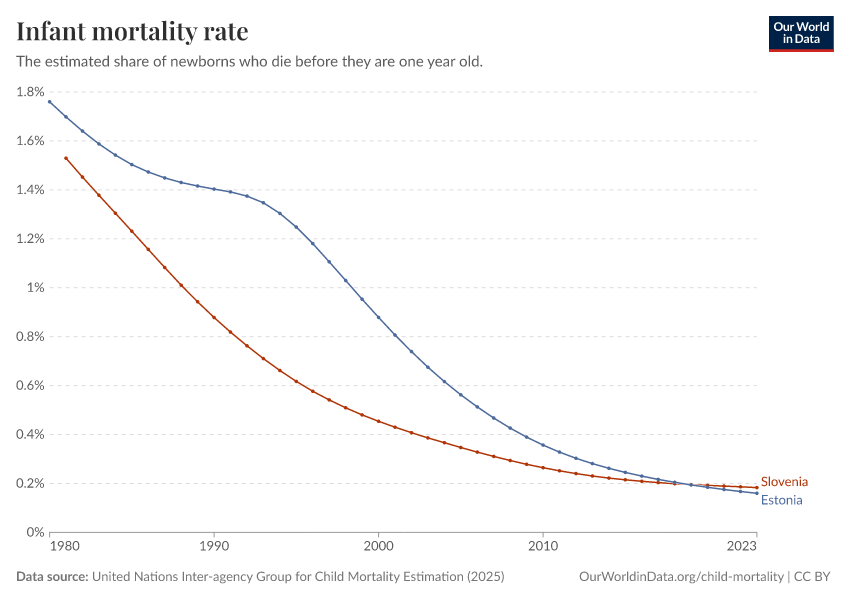 United Nations Inter-agency Group for Child Mortality Estimation (2025) – with minor processing by Our World in Data. “Infant mortality rate” [dataset]. United Nations Inter-agency Group for Child Mortality Estimation, “United Nations Inter-agency Group for Child Mortality Estimation”; Various sources, “Population” [original data]. Retrieved February 25, 2026 from https://drop-density-mdim.owid.pages.dev:8789/20260119-070102/grapher/infant-mortality.html (archived on January 19, 2026).