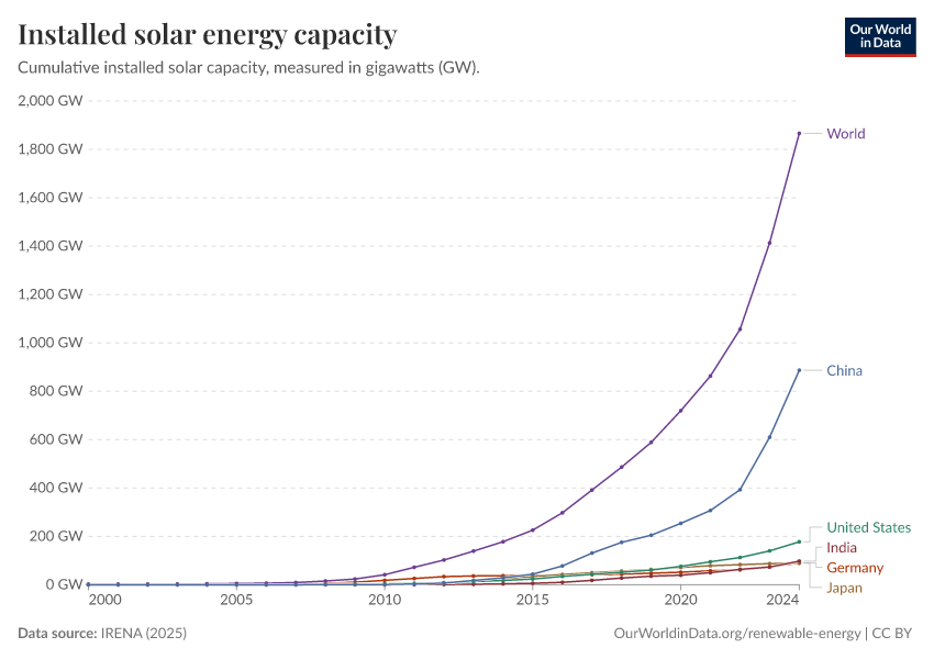 “Data Page: Total solar capacity”, part of the following publication: Hannah Ritchie, Pablo Rosado, and Max Roser (2023) - “Energy”. Data adapted from IRENA. Retrieved from https://drop-density-mdim.owid.pages.dev:8789/20260119-065148/grapher/installed-solar-pv-capacity.html [online resource] (archived on January 19, 2026).How to cite this data