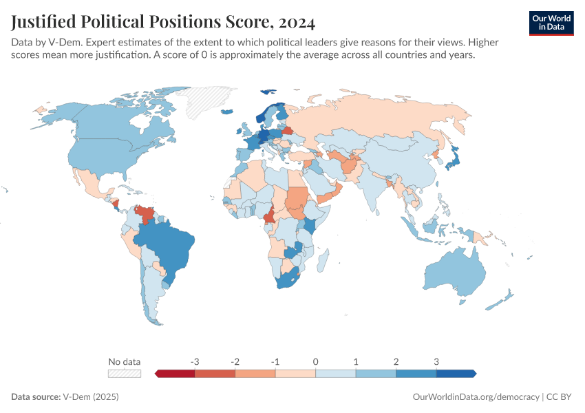 V-Dem (2025) – processed by Our World in Data. “Justified political positions – V-Dem” [dataset]. V-Dem, “Democracy report v15” [original data]. Retrieved February 25, 2026 from https://drop-density-mdim.owid.pages.dev:8789/20260204-170225/grapher/justified-political-positions-score.html (archived on February 4, 2026).