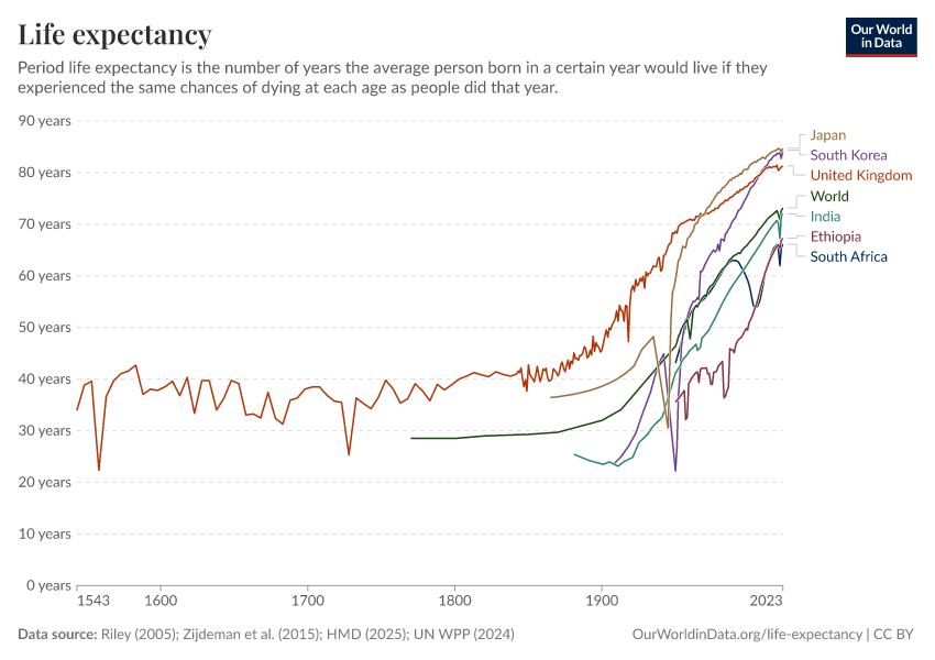 “Data Page: Life expectancy”, part of the following publication: Saloni Dattani, Lucas Rodés-Guirao, Hannah Ritchie, Esteban Ortiz-Ospina, and Max Roser (2023) - “Life Expectancy”. Data adapted from Human Mortality Database, United Nations, Zijdeman et al., James C. Riley. Retrieved from https://drop-density-mdim.owid.pages.dev:8789/20260225-014904/grapher/life-expectancy.html [online resource] (archived on February 25, 2026).
