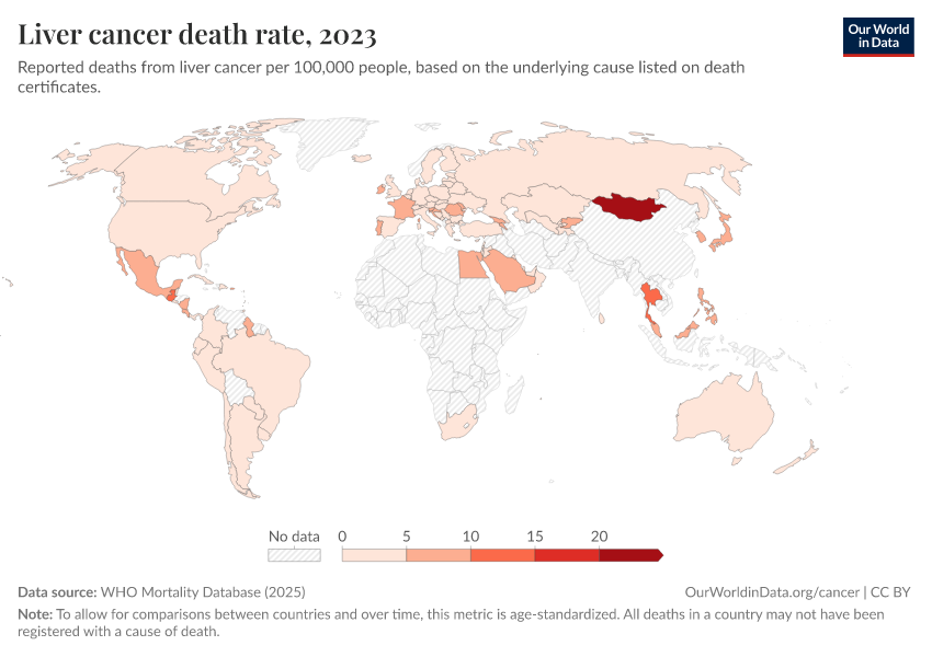 WHO Mortality Database (2025) – with minor processing by Our World in Data. “Liver cancer death rate” [dataset]. WHO Mortality Database, “WHO Mortality Database” [original data]. Retrieved February 25, 2026 from https://drop-density-mdim.owid.pages.dev:8789/20250909-093708/grapher/liver-cancer-death-rate.html (archived on September 9, 2025).
