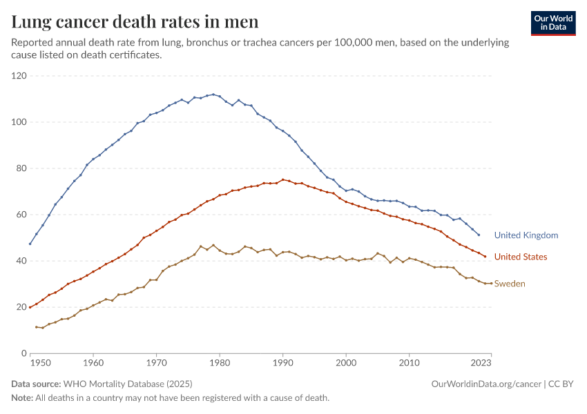 “Data Page: Lung cancer death rates in men”, part of the following publication: Saloni Dattani, Fiona Spooner, Hannah Ritchie, and Max Roser (2023) - “Causes of Death”. Data adapted from WHO Mortality Database. Retrieved from https://drop-density-mdim.owid.pages.dev:8789/20250909-093708/grapher/lung-cancer-death-rates-males.html [online resource] (archived on September 9, 2025).How to cite this data
