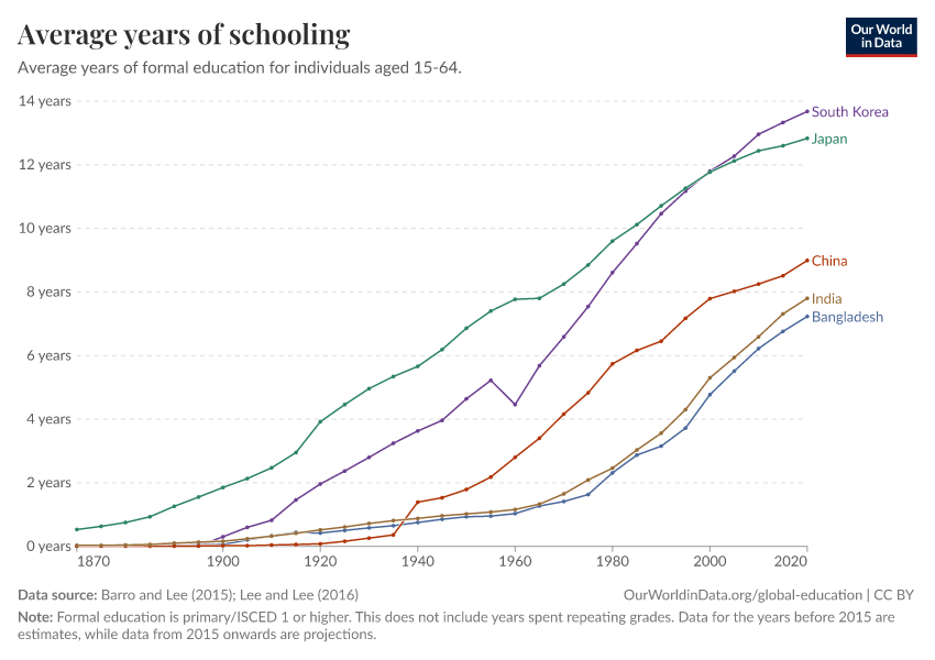 Barro and Lee (2015); Lee and Lee (2016) – with major processing by Our World in Data. “Average years of schooling” [dataset]. Barro and Lee, “Projections of Educational Attainment”; Lee and Lee, “Human Capital in the Long Run” [original data]. Retrieved February 25, 2026 from https://drop-density-mdim.owid.pages.dev:8789/20260119-070102/grapher/mean-years-of-schooling-long-run.html (archived on January 19, 2026).
