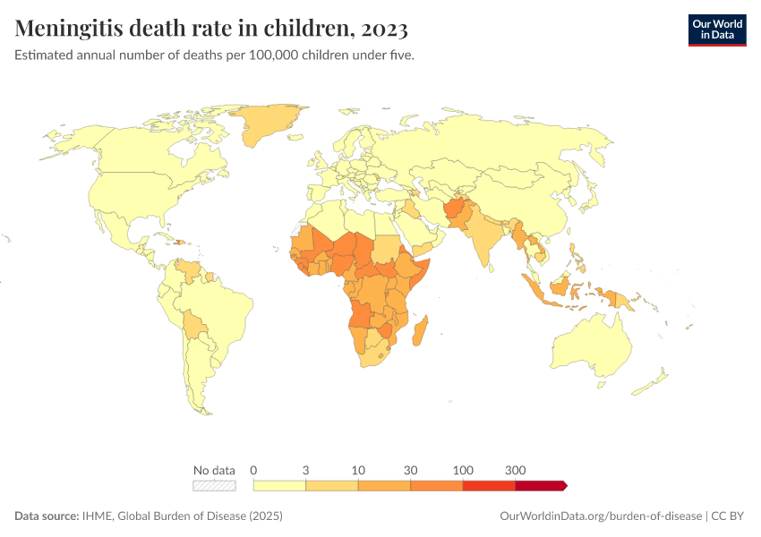 IHME, Global Burden of Disease (2025) – with major processing by Our World in Data. “Meningitis death rate in children” [dataset]. IHME, Global Burden of Disease, “Global Burden of Disease - Deaths” [original data]. Retrieved February 25, 2026 from https://drop-density-mdim.owid.pages.dev:8789/20260211-174736/grapher/meningitis-death-rates-children-under-5.html (archived on February 11, 2026).