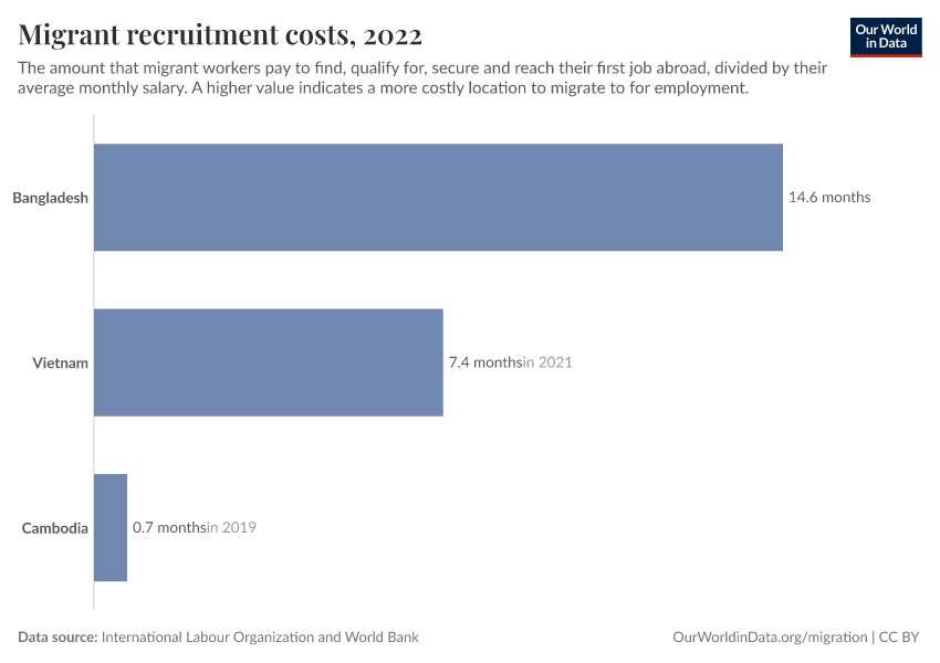 “Data Page: Migrant recruitment costs”. Our World in Data (2026). Data adapted from International Labour Organization and World Bank. Retrieved from https://drop-density-mdim.owid.pages.dev:8789/20251120-211749/grapher/migrant-recruitment-costs.html [online resource] (archived on November 20, 2025).How to cite this data