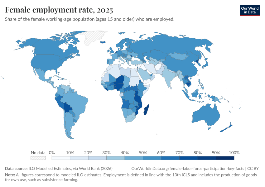 “Data Page: Female employment-to-population ratio”. Our World in Data (2026). Data adapted from ILO Modelled Estimates, via World Bank. Retrieved from https://drop-density-mdim.owid.pages.dev:8789/20260203-104517/grapher/modeled-female-employment-to-population-ratio.html [online resource] (archived on February 3, 2026).How to cite this data