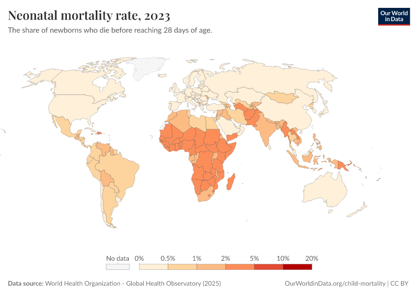 World Health Organization - Global Health Observatory (2025) – processed by Our World in Data. “Neonatal mortality rate” [dataset]. World Health Organization, “Global Health Observatory” [original data]. Retrieved February 25, 2026 from https://drop-density-mdim.owid.pages.dev:8789/20260119-070102/grapher/neonatal-mortality-rate-gho.html (archived on January 19, 2026).