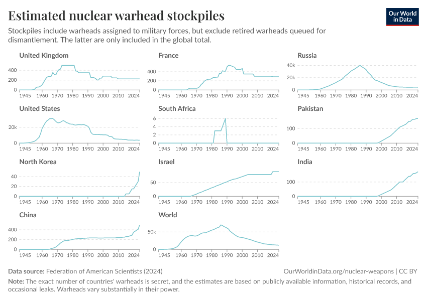 “Data Page: Estimated nuclear warhead stockpiles”, part of the following publication: Bastian Herre, Pablo Rosado, and Max Roser (2024) - “Nuclear Weapons”. Data adapted from Federation of American Scientists. Retrieved from https://drop-density-mdim.owid.pages.dev:8789/20250909-093708/grapher/nuclear-warhead-stockpiles-lines.html [online resource] (archived on September 9, 2025).How to cite this data