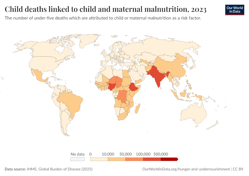 IHME, Global Burden of Disease (2025) – with major processing by Our World in Data. “Child deaths linked to child and maternal malnutrition” [dataset]. IHME, Global Burden of Disease, “Global Burden of Disease - Risk Factors - Deaths” [original data]. Retrieved February 25, 2026 from https://drop-density-mdim.owid.pages.dev:8789/20260213-112438/grapher/number-child-deaths-malnutrition.html (archived on February 13, 2026).