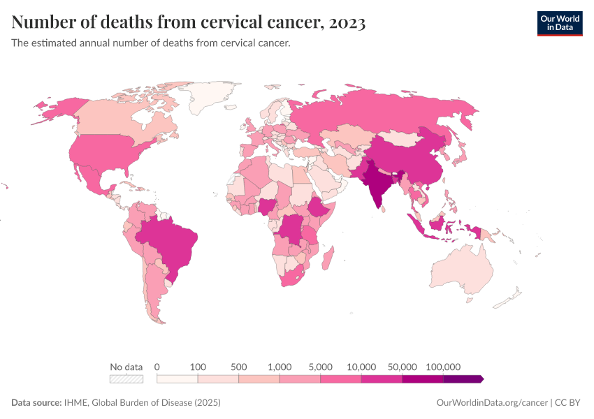 IHME, Global Burden of Disease (2025) – with major processing by Our World in Data. “Number of deaths from cervical cancer” [dataset]. IHME, Global Burden of Disease, “Global Burden of Disease - Deaths” [original data]. Retrieved February 25, 2026 from https://drop-density-mdim.owid.pages.dev:8789/20260211-174736/grapher/number-of-deaths-from-cervical-cancer.html (archived on February 11, 2026).