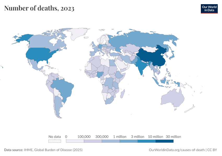 “Data Page: Number of deaths”, part of the following publication: Esteban Ortiz-Ospina and Max Roser (2016) - “Global Health”. Data adapted from IHME, Global Burden of Disease. Retrieved from https://drop-density-mdim.owid.pages.dev:8789/20260211-174736/grapher/number-of-deaths-gbd.html [online resource] (archived on February 11, 2026).How to cite this data