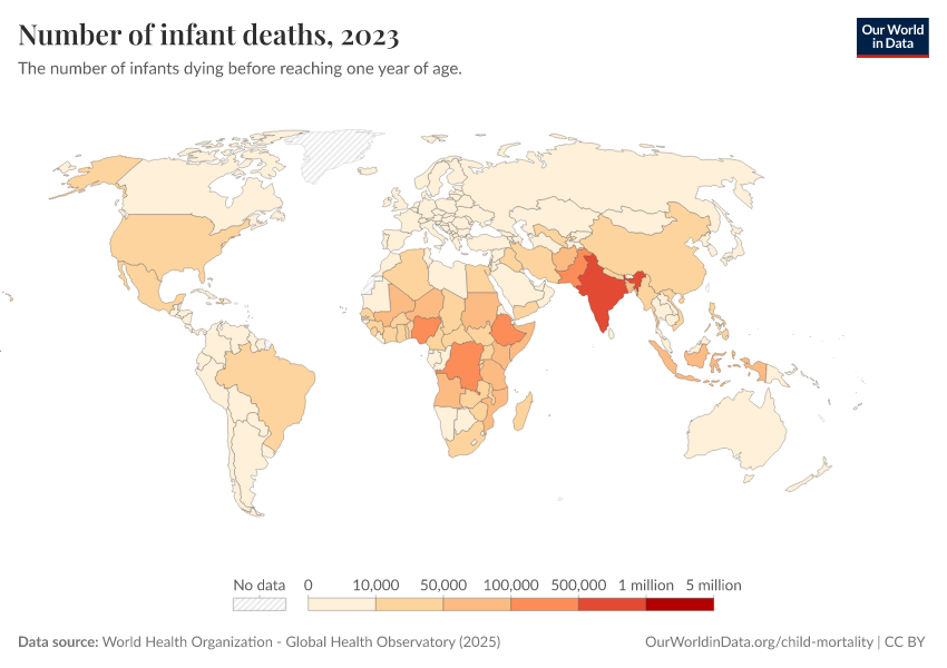 World Health Organization - Global Health Observatory (2025) – processed by Our World in Data. “Number of infant deaths” [dataset]. World Health Organization, “Global Health Observatory” [original data]. Retrieved February 25, 2026 from https://drop-density-mdim.owid.pages.dev:8789/20260119-070102/grapher/number-of-infant-deaths-gho.html (archived on January 19, 2026).