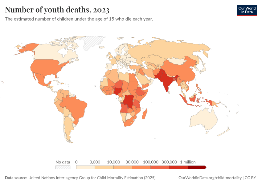 United Nations Inter-agency Group for Child Mortality Estimation (2025) – with minor processing by Our World in Data. “Under-fifteen deaths” [dataset]. United Nations Inter-agency Group for Child Mortality Estimation, “United Nations Inter-agency Group for Child Mortality Estimation”; UN Inter-agency Group for Child Mortality Estimation, “Child Mortality Estimates 2018”; Various sources, “Population” [original data]. Retrieved February 25, 2026 from https://drop-density-mdim.owid.pages.dev:8789/20260223-071105/grapher/number-of-youth-deaths.html (archived on February 23, 2026).