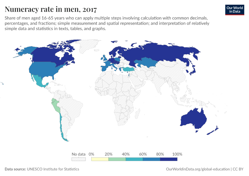 “Data Page: Numeracy rate in men”. Our World in Data (2026). Data adapted from UNESCO Institute for Statistics. Retrieved from https://drop-density-mdim.owid.pages.dev:8789/20251120-211749/grapher/numeracy-rate-in-adult-men.html [online resource] (archived on November 20, 2025).How to cite this data