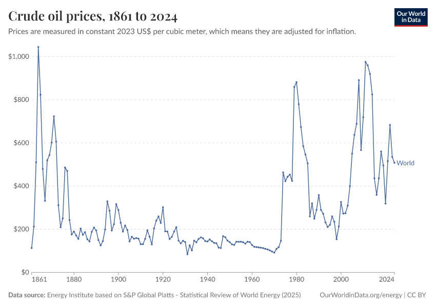 “Data Page: Oil price - Crude prices since 1861”, part of the following publication: Hannah Ritchie, Pablo Rosado, and Max Roser (2023) - “Energy”. Data adapted from Energy Institute. Retrieved from https://drop-density-mdim.owid.pages.dev:8789/20250909-093708/grapher/oil-prices-inflation-adjusted.html [online resource] (archived on September 9, 2025).How to cite this data