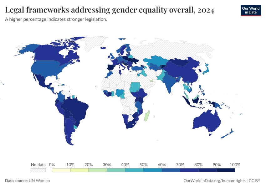 “Data Page: Legal frameworks addressing gender equality overall”. Our World in Data (2026). Data adapted from UN Women. Retrieved from https://drop-density-mdim.owid.pages.dev:8789/20260130-180113/grapher/overarching-legal-frameworks-regarding-gender-equality.html [online resource] (archived on January 30, 2026).How to cite this data