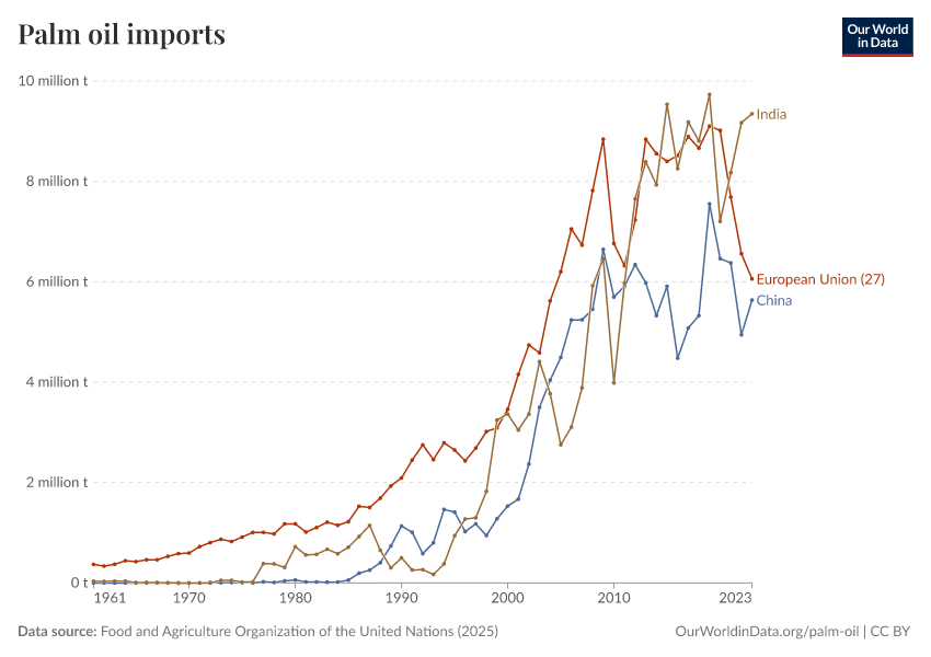 “Data Page: Imports of palm oil”. Our World in Data (2026). Data adapted from Food and Agriculture Organization of the United Nations. Retrieved from https://drop-density-mdim.owid.pages.dev:8789/20260116-144923/grapher/palm-oil-imports.html [online resource] (archived on January 16, 2026).