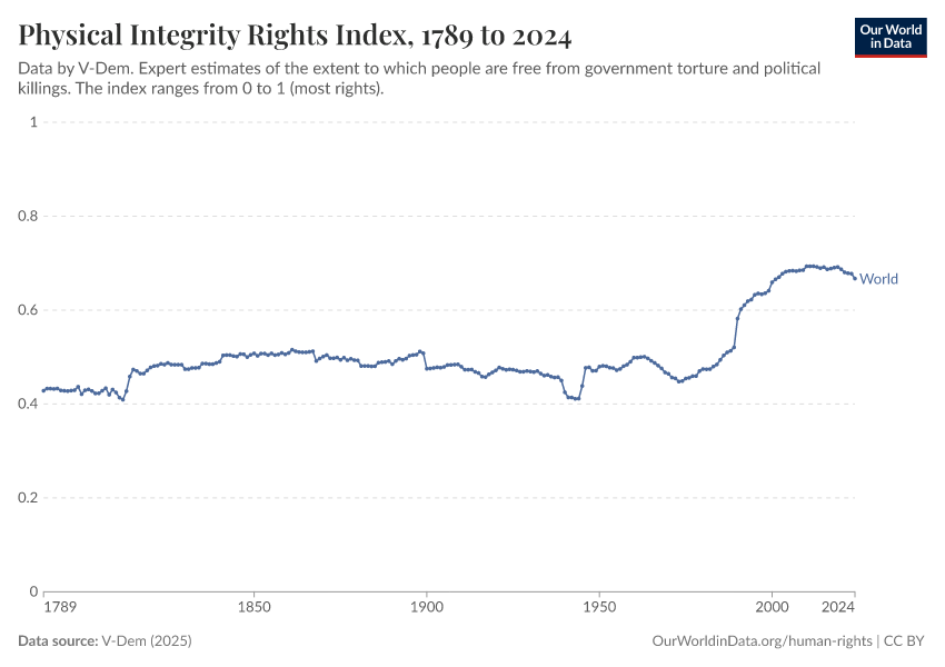 “Data Page: Physical violence index”, part of the following publication: Bastian Herre, Lucas Rodés-Guirao, and Esteban Ortiz-Ospina (2013) - “Democracy”. Data adapted from V-Dem. Retrieved from https://drop-density-mdim.owid.pages.dev:8789/20260119-070102/grapher/physical-integrity-rights-index-vdem.html [online resource] (archived on January 19, 2026).