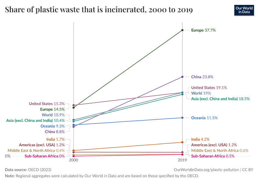 “Data Page: Share of plastic waste that is incinerated”, part of the following publication: Hannah Ritchie, Veronika Samborska, and Max Roser (2023) - “Plastic Pollution”. Data adapted from OECD. Retrieved from https://drop-density-mdim.owid.pages.dev:8789/20250909-093708/grapher/plastic-waste-incinerated.html [online resource] (archived on September 9, 2025).How to cite this data