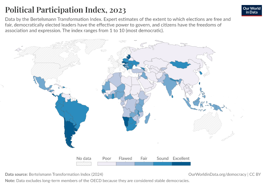 Bertelsmann Transformation Index (2024) – processed by Our World in Data. “Political Participation Index” [dataset]. Bertelsmann Transformation Index, “Bertelsmann Transformation Index, Scores” [original data]. Retrieved February 25, 2026 from https://drop-density-mdim.owid.pages.dev:8789/20260105-133053/grapher/political-participation-index-bti.html (archived on January 5, 2026).