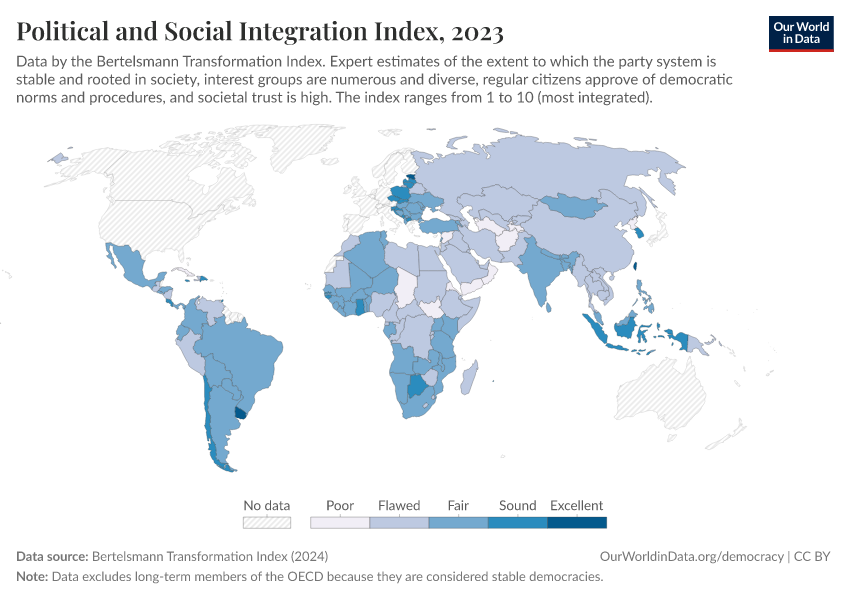 “Data Page: Political and Social Integration Index”, part of the following publication: Bastian Herre, Lucas Rodés-Guirao, and Esteban Ortiz-Ospina (2013) - “Democracy”. Data adapted from Bertelsmann Transformation Index. Retrieved from https://drop-density-mdim.owid.pages.dev:8789/20260105-133053/grapher/political-social-integration-index-bti.html [online resource] (archived on January 5, 2026).How to cite this data
