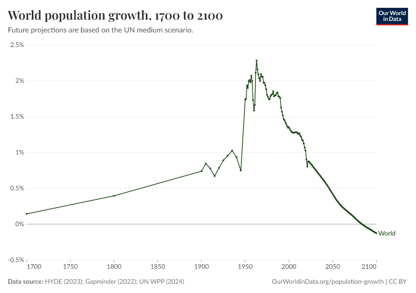 “Data Page: World population growth”, part of the following publication: Hannah Ritchie, Lucas Rodés-Guirao, Edouard Mathieu, Marcel Gerber, Esteban Ortiz-Ospina, Joe Hasell, and Max Roser (2023) - “Population Growth”. Data adapted from PBL Netherlands Environmental Assessment Agency, Gapminder, United Nations. Retrieved from https://drop-density-mdim.owid.pages.dev:8789/20260223-142202/grapher/population-growth-rate.html [online resource] (archived on February 23, 2026).How to cite this data