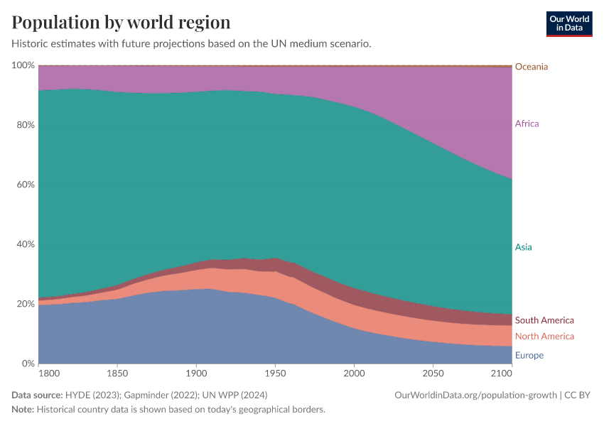 “Data Page: Population by world region”, part of the following publication: Hannah Ritchie, Lucas Rodés-Guirao, Edouard Mathieu, Marcel Gerber, Esteban Ortiz-Ospina, Joe Hasell, and Max Roser (2023) - “Population Growth”. Data adapted from PBL Netherlands Environmental Assessment Agency, Gapminder, United Nations. Retrieved from https://drop-density-mdim.owid.pages.dev:8789/20260119-065148/grapher/population-regions-with-projections.html [online resource] (archived on January 19, 2026).