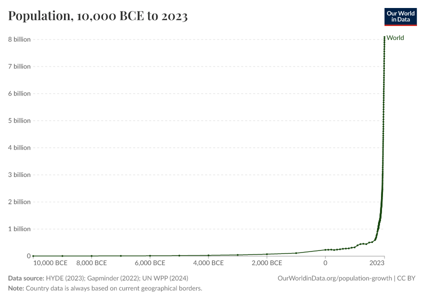 HYDE (2023); Gapminder (2022); UN WPP (2024) – with major processing by Our World in Data. “Population – HYDE, Gapminder, UN – Long-run data” [dataset]. PBL Netherlands Environmental Assessment Agency, “History Database of the Global Environment 3.3”; Gapminder, “Population v7”; United Nations, “World Population Prospects”; Gapminder, “Systema Globalis” [original data]. Retrieved February 25, 2026 from https://drop-density-mdim.owid.pages.dev:8789/20260119-065148/grapher/population.html (archived on January 19, 2026).
